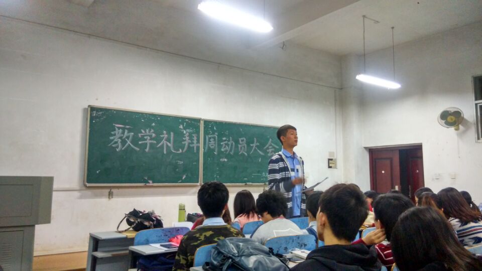 深秋的凉风吹起学风建设的大旗,湖南科技大学一年一度的教学礼拜周活动如约而至,为了响应学校的号召,加强学院学风建设,提高教学质量,2015年11月5日17:50,教育学院于第八教学楼1-5召开了教学礼拜周动员大会。参加本次大会的成员有学工办主任李涛老师,第十七届团委学生会全体干部,以及13,14,15级各班的班长和团支书。
