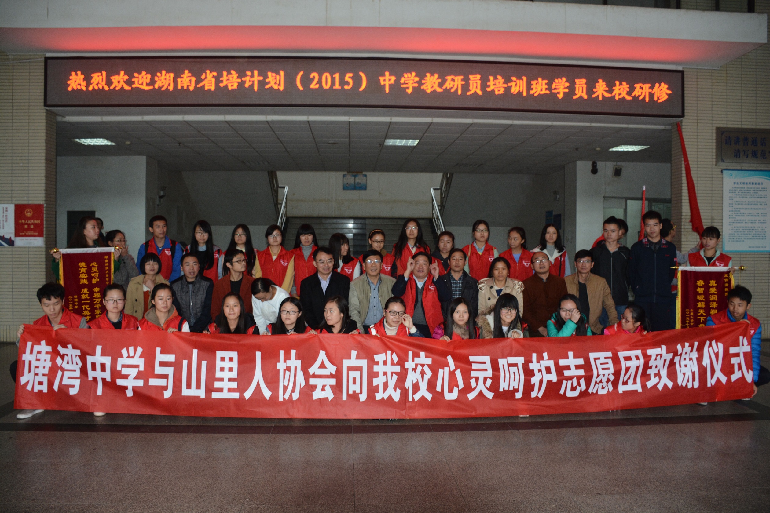 2015年10月31日上午,塘湾中学与山里人协会向我校心灵呵护志愿团致谢仪式隆重举行,莅临仪式的嘉宾代表有:湖南科技大学青少年儿童心灵呵护志愿团指导教师暨教育学院党委副书记王伟清、湖南科技大学团委、党委宣传部、教育学院、研究生院等部门有关领导 、各大学教授、及塘湾中学代表唐许汉校长等人、山里人协会代表戴志斌等人。
