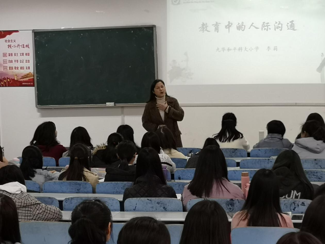 李莉老师以一个字谜游戏导入,引出教育的主体——人,并结合自身多年从教的经历,通过大量的教育教学案例,从敬畏生命、理解儿童、依循规律三个层面阐释了平等、尊重、包容师生关系的建立,鼓励同学们真正捧出一颗心去爱学生、从心底里信任每一个孩子都有向善的倾向,在理解孩子的同时学会用善举去影响孩子、做孩子生命中的贵人,同学们纷纷表示,李莉校长的讲座对提升同学们教育教学素养受益匪浅。