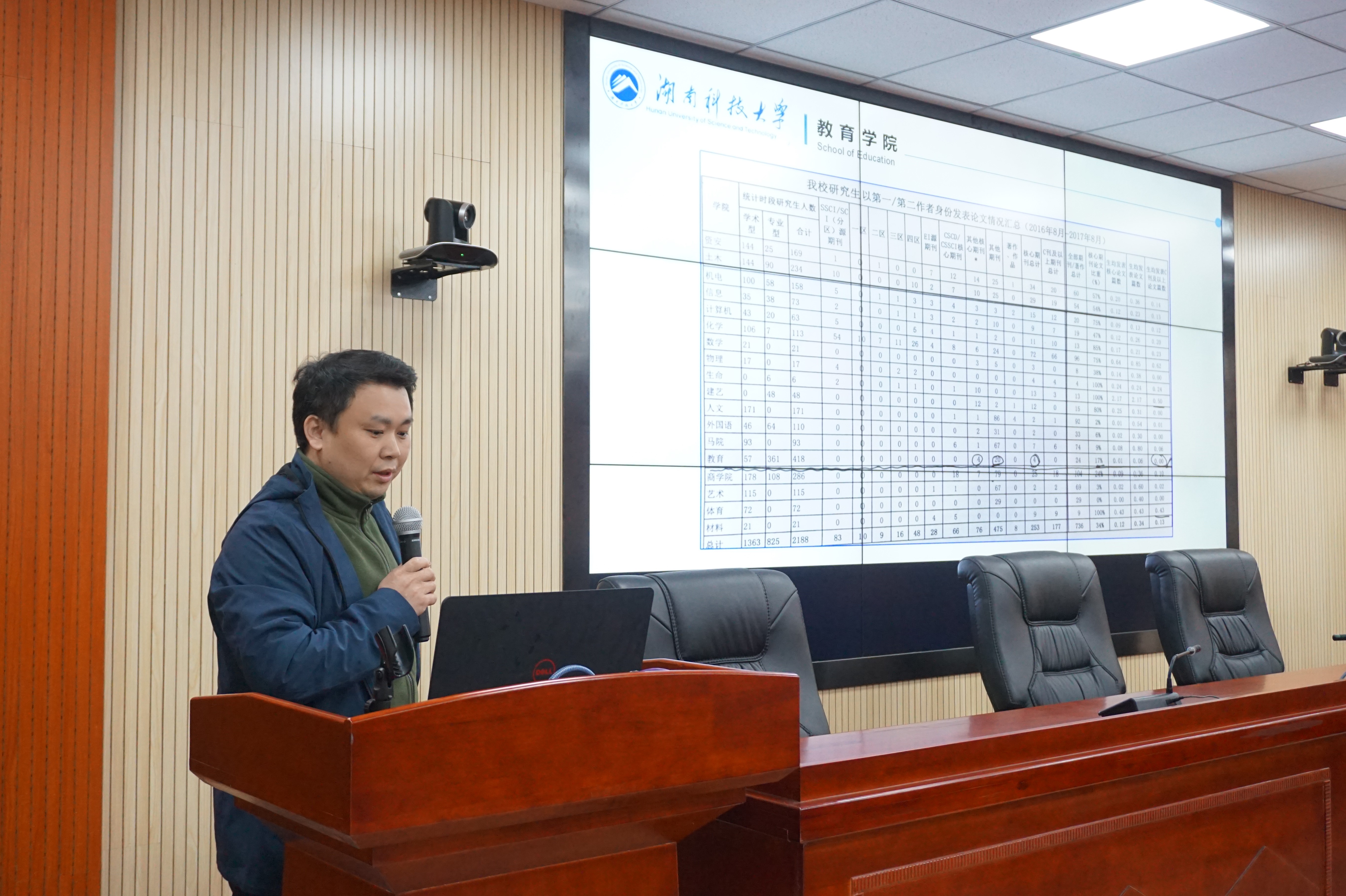 为推动“双一流”建设,贯彻学校学位与研究生教育改革精神,加强和促进硕士研究生指导教师队伍建设,根据《教育部关于全面落实研究生导师立德树人职责的意见》和《湖南科技大学硕士研究生指导教师管理办法》文件要求,教育学院于2018年3月20日下午组织召开了学位与研究生教育工作研讨会,会议由我院党委书记李炳煌主持。