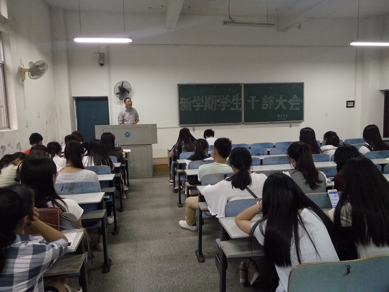 这次大会由学工办主任李涛老师主持。他对于新学期各项工作的开展,主要提到以下几点:第一,做好思想动态调查以及危机信息搜集与干预工作。从2016年暑期发生的几起网络、电信诈骗问题中吸取经验教训,对学生网络贷款、接收异常短信或电话等现象给予更多关注与重视,并对已出现相关问题的同学进行心灵疏导。第二,加强学风建设。从8月29号即正式开学日期起,各学生干部要检查除2016级新生外各年级学生的早读、晚自习出勤情况,学生会相关部门要提前安排好各班自习教室。第三,整顿宿舍纪律。晚归、擅自在外租房、违规饲养宠物、骑行或在宿舍楼下停放摩托车,这些行为都是禁止的,学生干部们要完善消息下达机制,将各大通知规定传达给每名同学。