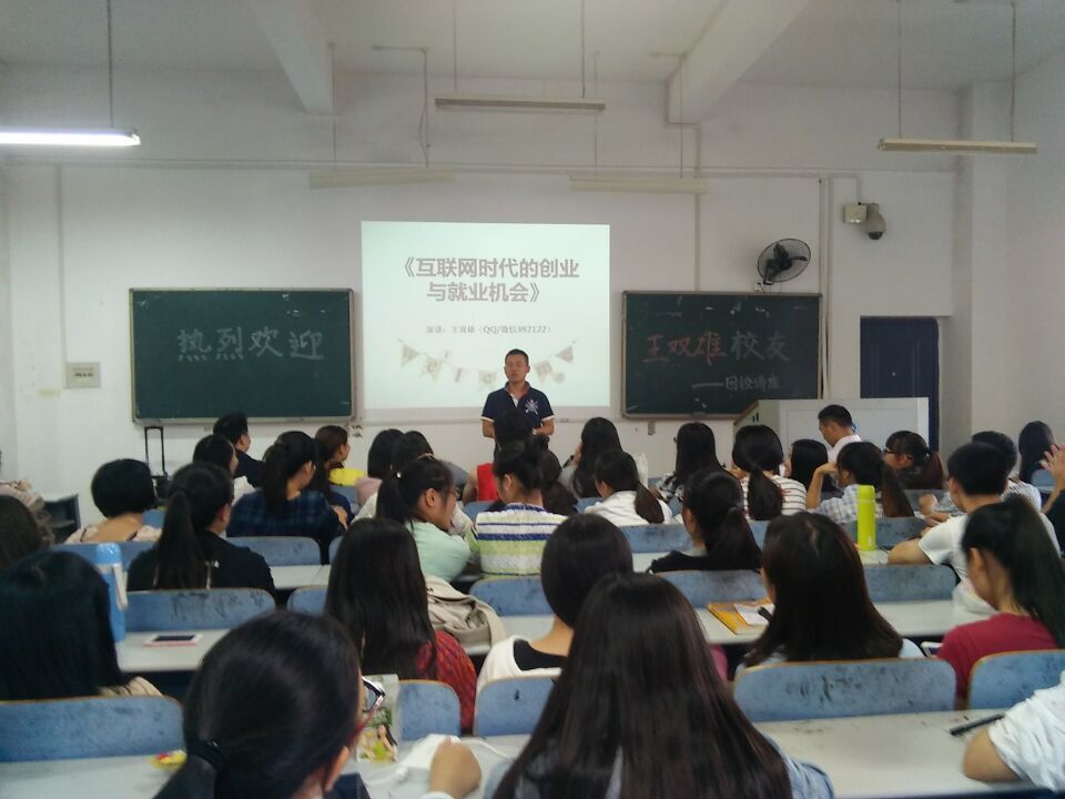 2015年10月20日14点30分,第八教学楼3-4教室隆重举行主题为《互联网时代的创业与就业》的讲座,校友资源部请来了优秀校友、心理营销教父、向上企业董事长、周六微商网校联合创办人王双雄面向教育学院应用心理学专业和相关兴趣同学进行现场讲座。王双雄毕业于湖南388vip太阳集团应用心理学专业,曾为学院学生会主席,学习成绩优异,现于微商行业成绩佼佼。教育学院王伟清副书记亲临现场为同学们隆重介绍主讲人,谭千保老师全程参与并作了总结陈词。