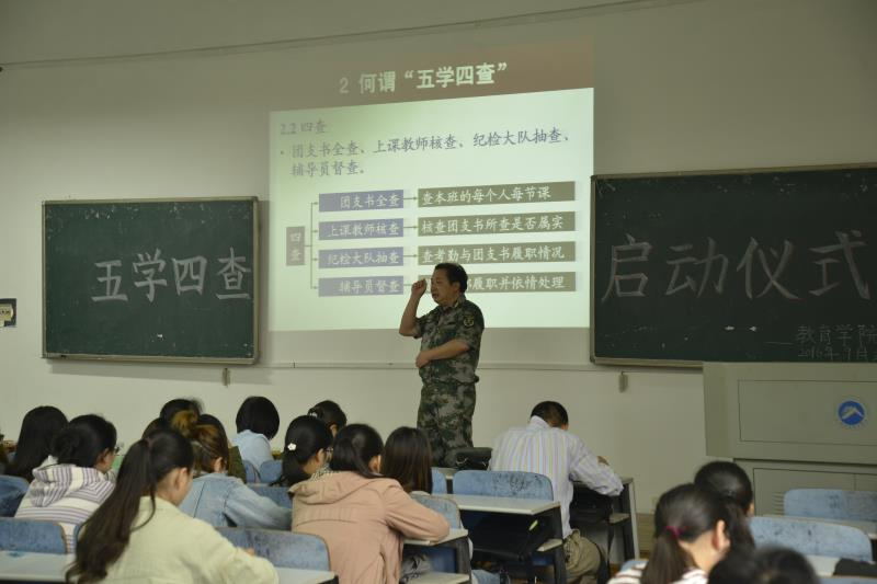 大会开始首先由王伟清书记为大家讲解何谓“五学四查”,如何去做好“五学四查”的各项工作。所谓“五学”是指邀学即邀请别人一起去学习;劝学即劝说别人去好好学习;缠学即缠着别人一起去学习;督学即督促别人去好好学习;帮学即帮助别人搞好学习。所谓“四查”是指团支书全查即查本班的每个人每节课;上课教师核查即核查团支书所查是否属实;纪检大队抽查即查考勤和团支书履职情况;辅导员督查即督查干部屡职并依情处理。虽然“五学四查”的主体客体和任务都不尽相同,但其最终目的是一样的,都是营造学院全体良好的学习氛围,鼓励每一个学生参与到投入爱学习甚至乐于学习的行列之中来。那么如何搞好“五学四查”?书记说道:“最为本质的是要建立五学机制和纪律制度促自觉。第一点针对挂科和四级未过的同学开展帮扶计划监督工作,各学委应积极配合学习部做好登记工作。第二点不断完善、全面实施和严格执行‘四查制度’、‘账本制度’、和‘挂钩制度’,进而促使各个同学提高对学风建设的高度重视。第三点建立纪律制度包括日常查课制度、课堂考勤制度以及相应的处理细则。”书记表示据往年的数据反映,教育学院“五学四查”的成效十分显著,很多的学生由被动接受学习转变为主动投入学习,学院的考研率逐年上升,四六级通过率位于全校前茅,党校合格率百分之百,出现了一大批优秀帮扶者、成功转变者以及成功变优者。