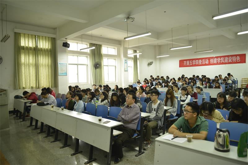 为了抵制不良文化的负面影响,营造良好的学习氛围,提高学风建设的实效性,创造学风建设特色,创建良好的特色文化,教育学院对学风建设进行了多年的探索,形成了“五学四查”的理念和做法。为了推广新做法,2016年10月11日15:00在第八教学楼1―4开展新学期“五学四查”会议,莅临本次大会的嘉宾有教育学院院长李海萍教授、院党委副书记王伟清教授、学工办辅导员尹琼芳老师、李涛老师、练素华老师以及教务办主任王方老师,还有14、15级各班班长、团支书、危机信息员和学习委员。