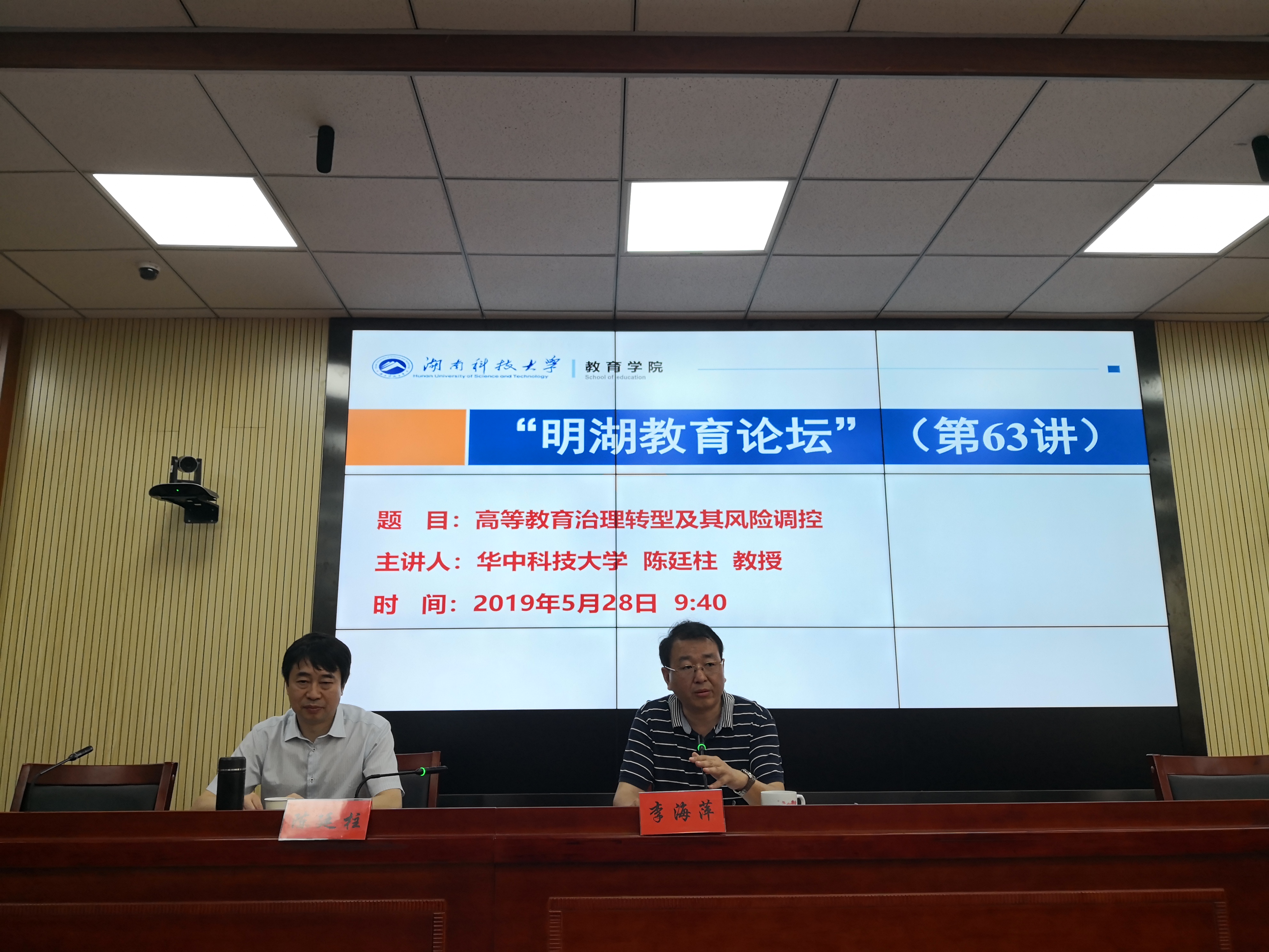 2019528日上午,华中科技大学教育科学研究院院长、博士生导师陈廷柱教授做客“明湖教育论坛”,为我院师生带来题为“项目治教:高等教育治理转型及其风险控制”的学术报告。报告会由教育学院院长李海萍主持。
