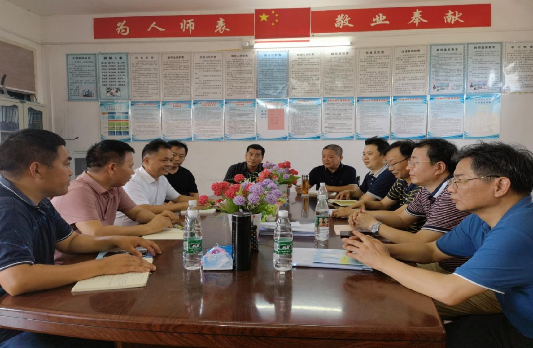 会上,高文华简要介绍了支教团的基本情况,他要求支教团成员既要高质量地完成支教工作,又要积极参与驻村“乡村振兴”工作队的相关工作,做到志愿支教、驻村帮扶、专业学习“三不误”,并对黄桥镇、永发村及永发小学给予支教工作的大力支持表示感谢。李海萍要求支教团全体成员及时转换角色,在研究生院、永发小学及驻村“乡村振兴”工作队的精心组织下,安全、出色完成工作、帮扶、学习等各项任务。黄桥镇党委、黄桥镇中心校相关负责人对我校选派“研究生志愿支教团”对口支援永发小学、助力永发乡村振兴表示感谢,对“研究生志愿支教团”表示热烈欢迎并寄予厚望。永发小学王校长介绍了学校基本情况,“研究生志愿支教团”团长赵理欣代表全体支教成员做了表态性发言。最后,校驻永发村“乡村振兴”工作队队长廖巍从遵守纪律、外树形象、学好本领、做出成绩等四个方面对“研究生支教团”提出了具体要求。