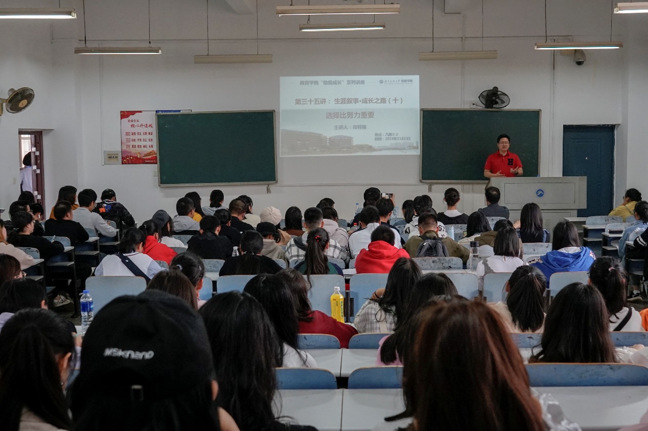 为庆祝湖南科技大学办学70周年,优秀校友荣归母校,11月2日,教育学院于第八教学楼顺利举办“助我成长”系列(三十三、三十四三十五)——“生涯叙事·成长之路”(八、九十)校友讲座。院2010级应用心理学专业本科毕业生蒋乐玲、2000级教育学专业本科毕业生程燕2002级教育技术学专业本科毕业生肖特强三位校友受邀前来分享各自的在校经历成长故事。教育学院相关负责人及学生代表到场聆听。