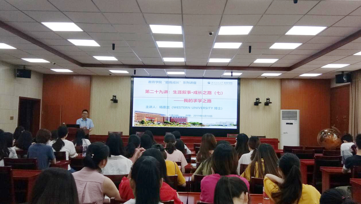 2019年6月18日上午10点,我院特邀优秀校友—来自加拿大Western University在读博士生杨惠兰作为报告人,在第八教学楼308教室为我院学生带来“助我成长”系列讲座第二十九讲:生涯叙事·成长之路——我的求学之路的讲座。教育学院16级应用心理学专业及其他感兴趣的同学到场聆听。