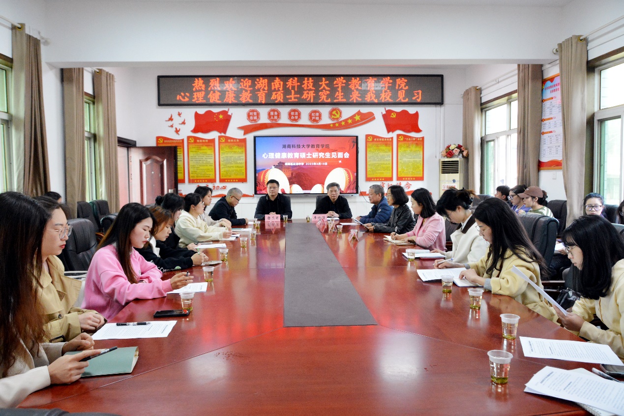 3月15日,教育学院2022级教育硕士(心理健康教育专业领域)全体研究生在教育学院党委书记李炳煌教授、刘成伟老师和林艳阳老师的带领下,赴湘潭县云龙中学开展教育见习。见习见面会在云龙中学会议室举行。云龙中学校长唐乐军、心理中心主任蔡子辉教授与会。会议由蔡子辉主持。