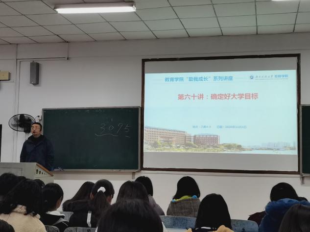 为帮助20级新生确立大学目标,度过一个充实且有意义的大学生活,12月1日下午16:00,教育学院在第八教学楼4-3教室开展主题为“确定好大学目标”的“助我成长”第六十讲讲座。讲座由20级辅导员李涛主讲,全体20级新生到场聆听。